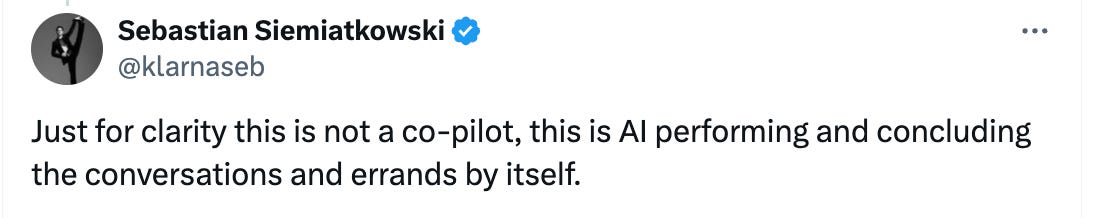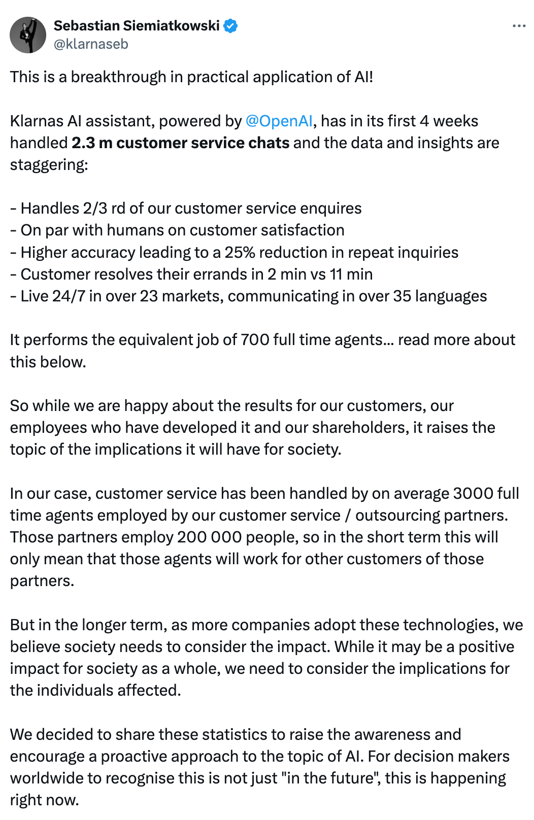 I’m not sure Klarna is the first company to do this at scale, but they are the first to publicly state that they are doing it.