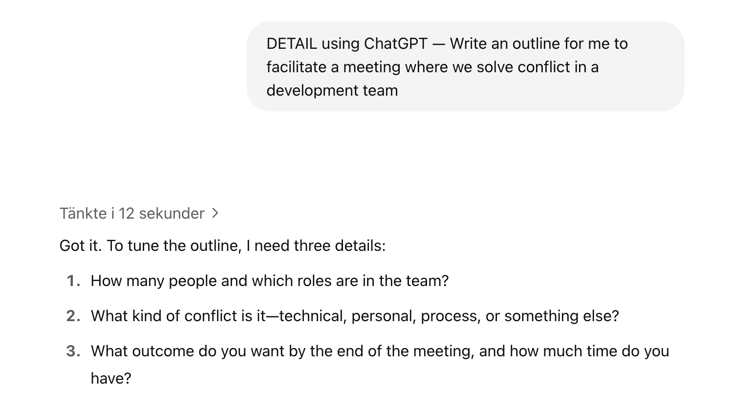 - "DETAIL using ChatGPT — Write an outline for me to facilitate a meeting where we solve conflict in a development team."