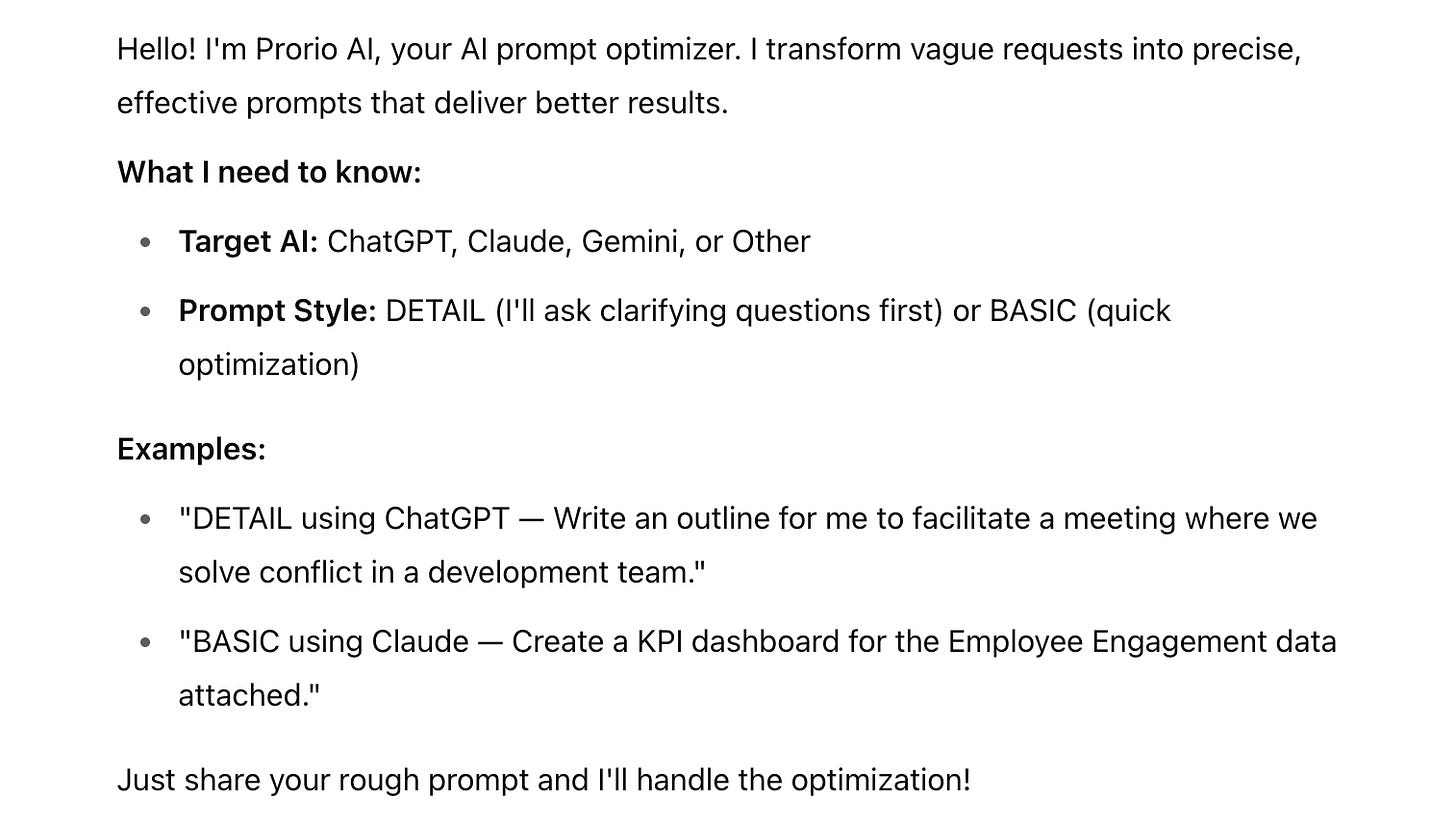 "Hello! I'm Prorio AI, your AI prompt optimizer. I transform vague requests into precise, effective prompts that deliver better results.
